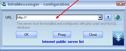 Welcome to Your Instant Messenger ServerDownload and run im_setup.reg BEFORE installing, see below for easy setup and avoid the last step. or ![]() On IntraMessenger startup, configure the address (URL) : http://www.admfincas.msicanarias.com:443/ ![]() |